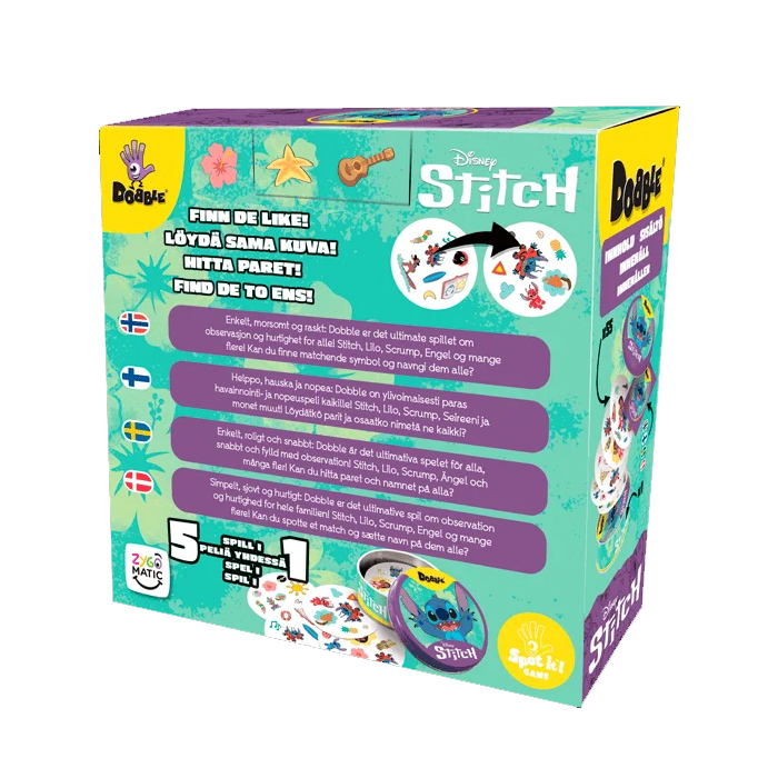 I Dobble finns det bara en gemensam symbol mellan två kort. Var först med att hitta matchningen för att vinna! Denna Stitch-utgåva kommer i en specialdesignad plåtask och har symboler inspirerade av den ikoniska filmen Lilo & Stitch och dess karaktärer.